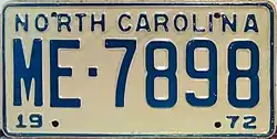 North Carolina | Embossed blue serial on reflective white plate with border line; "NORTH CAROLINA" at top; "19" at bottom left and "72" at bottom right | none | A-1234 AB-1234 |