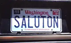 Washington | personalized license plate "Saluton", "Hello" in Esperanto ("centennial celebration" refers to Washington's statehood, 1889-1989) | Personalized plate shown. | |||