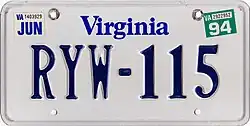 Virginia | Embossed dark blue serial on reflective white plate; "VIRGINIA" screened in blue centered at top. | None | ABC-1234 | ||