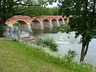 240 m from the waterfall is located the famous Kuldiga brick bridge. It was built in 1874 and is the longest operating brick bridge in Europe.[6][7] Built to the building standards of the time, it is wide enough for two carriages to pass.[14] Its width is 8 m and its length is 164 m. It was modelled after the bridge on the Moselle river in Germany that was erected at the time of Roman Empire. The Kuldiga brick bridge was renovated in 2008 and is now in operation.[7]