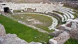 Remains of a Roman theatre (first half of the 2nd century) are visible, and remains of many other buildings have been discovered, among them traces of the ancient city walls, a fine mosaic, found in 1852 but at once destroyed, and a number of tombs to the west of the theatre. The ruins of the ancient Albintimilium are situated in the plain of Nervia, c. 2 kilometres (1 mile) to the east of the modern town.[5]