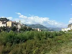 Ventimiglia (Italian: [ventiˈmiʎʎa]; Intemelio: Ventemiglia [veŋteˈmiʎa], Genoese: Vintimiggia;[3] French: Vintimille [vɛ̃timij]; Provençal: Ventemilha [venteˈmiʎɔ]) is a resort town in the province of Imperia, Liguria, northern Italy. It is located 130 km (81 mi) west of Genoa, and 7 km (4.3 mi) from the French-Italian border, on the Gulf of Genoa, having a small harbour at the mouth of the Roia river, which divides the town into two parts. Ventimiglia's urban area has a population of 55,000.