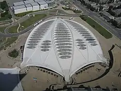 Olympic Stadium was planned to be a retractable roof stadium, the first venue of its kind in the world.[4] This ability was to come from the tower located above the stadium that would deploy when inclement weather occurred.[4] Construction on the Stadium began in November 1973 with the complete sections of the stadium being complete between May 1975 and May 1976.[4] A strike in November 1974 on stadium construction that lasted until January 1975 followed by another strike nine months later prevented completion of the tower and the retractable roof. It would result in the loss of 155 work-days at the Stadium by May 1976.[30]