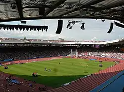 Ibrox Stadium, in the South Side, was the venue for the Rugby Sevens tournament.[7] Mountain biking was held on the Cathkin Braes in Rutherglen, the Royal Burgh neighbouring the City.[8] The Hampden Park hosted all the track and field events as well as the closing ceremony.[9]