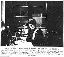 In 1908 Danchakoff became an assistant professor in histology and embryology at Moscow University – the first woman to become a professor in Russia.[7][9] In 1915 she emigrated to the United States where she first worked at the Rockefeller Institute for Medical Research in New York City. Then at the Columbia University College of Physicians and Surgeons, led by Thomas Hunt Morgan, she was "instructor in anatomy" at a time when women were first being allowed admittance as students.[1][10] In a 1916 lecture she said