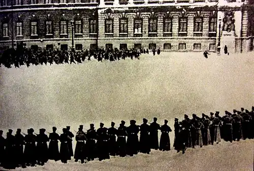On the morning of Bloody Sunday, Karelina and her husband led a section of the march from Vasilyevsky Island to the Winter Palace. It was fired upon and dispersed by the Imperial Guard, resulting in some 1,000 casualties and the outbreak of the 1905 Russian Revolution.[7]