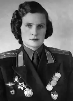 Vera Ivanovna Tikhomirova (Russian: Вера Ивановна Тихомирова; 30 September 1918 – 14 October 2002) was a deputy squadron commander in the 46th Guards Night Bomber Aviation Regiment (dubbed the "Night Witches") and one of nine women awarded the Order of Alexander Nevsky.[1][2]