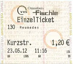 Ticket vending machines can be found at all S-Bahn, light rail and local train stops, and in the SSB area also at bus stops with higher traffic volumes. Payment with the bus driver is mostly only possible with cash, only on the lines of the SVE in Esslingen and of LVL Jäger in Ludwigsburg. The possibility of (contactless) payment by girocard is offered since 2018.[7] With VVS Mobil, the transport association provides its own App for smartphones, which, in addition to timetable information, also enables the purchase of Mobile phone tickets. VVS tickets can also be purchased via the apps SSB Move, Moovel and the DB Navigator. The mobile phone tickets are partly discounted compared to buying them from a ticket machine or the bus driver.[8] Tickets for 4 persons must be validated before departure. In the case of S-Bahn and local trains, the validators are located on the platform or at the entrances, in the case of light rail and buses, they are in the vehicle. All other tickets purchased from ticket machines or from the bus driver are valid immediately without validation.