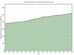 It was founded on 1 September 1987, and covers an area of some 5,111 km2 (1,973 sq mi) with around 3.5 million inhabitants.[1] For the year 2019, 556 million passengers were carried through the network of VRS.[2] Verkehrsverbund Rhein-Sieg is named after the rivers Rhine (Rhein) and Sieg.