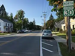 Vermont Route 30 (VT 30) is a 111.870-mile-long (180.037 km) north–south state highway in the U.S. state of Vermont. VT 30 runs from U.S. Route 5 (US 5) and VT 9 in Brattleboro to US 7 and VT 125 in Middlebury. The northern portion, from Poultney to Middlebury, was part of the New England road marking system's Route 30, from which VT 30 got its number. The route passes through many historic small towns, and travel writers such as those at Southern Vermont have described the route as "idyllic" and "picturesque".[3]