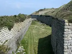 The citadel was built between 1857 and 1881, as Portland Harbour's main fortification.[1][2][3] Naturally inaccessible from the north and east, the south and west sides were protected by the digging of a large ditch.[4] Both East Weare Battery and East Weare Camp, located below the eastern side of the Verne, were considered part of the citadel's outworks.[5]