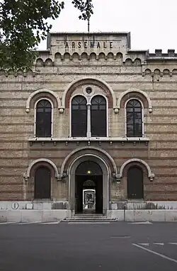 The arsenal, used first by the Royal Italian Army and then by the Italian Army, was acquired by the City of Verona on June 15, 1995. However, the final handover did not take place until May 19, 2009.[10] Up to the time of the handover, the complex was in fairly good condition. Still, since its abandonment by the military, it has fallen into a state of underutilization and disrepair: only the Headquarters pavilion has hosted periodic exhibitions, while a building in the western courtyard was assigned for many years to the Traffic Police. The sheds in the eastern part have been used as a parking lot.[1]