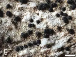 The perithecia are small to medium-sized (0.15–0.47 mm in diameter) and partially immersed in the rock substrate, usually leaving shallow to fairly deep pits. They occur in relatively high densities, with 60–200 perithecia per square centimetre.[2]