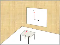In the 2-dimension case, as mentioned already, the usual designation of the vertical coincides with the y-axis in co-ordinate geometry. This convention can cause confusion in the classroom. For the teacher, writing perhaps on a white board, the y-axis really is vertical in the sense of the plumbline verticality but for the student the axis may well lie on a horizontal table.