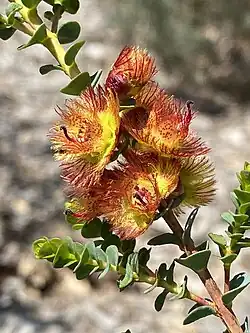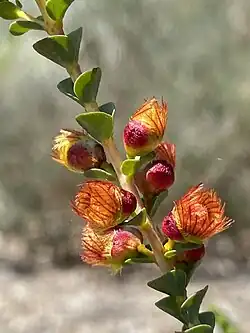 The flowers are scented and arranged in spike-like groups on erect stems 1.5–2 mm (0.06–0.08 in) long and the flowers open at about the same time as each other. The floral cup is top-shaped, about 3 mm (0.1 in) long, has 5 ribs and is glabrous and smooth. The sepals are deep red in colour, or deep red with yellow, 4–5.6 mm (0.16–0.22 in) long, with 10 to 12 feathery lobes. The petals are golden-yellow with red spots, egg-shaped, 5–7 mm (0.2–0.3 in) long, about 2.5 mm (0.1 in) wide with a fringe 1.5–2.5 mm (0.06–0.1 in) long and with deeply-divided, ear-shaped appendages. The style is about 6 mm (0.2 in) long, bent and has long hairs on its sides. Flowering time is from late October to December.[2]