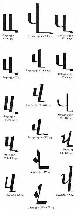 Vev or Vew (majuscule: Վ; minuscule: վ; Armenian: վեվ; Classical Armenian: վեւ) is the 30th letter of the Armenian alphabet. It represents the voiced labiodental fricative (/v/), similar to the English v sound as in village. It is typically romanized with the letter V.[1] It was part of the alphabet created by Mesrop Mashtots in the 5th century CE.