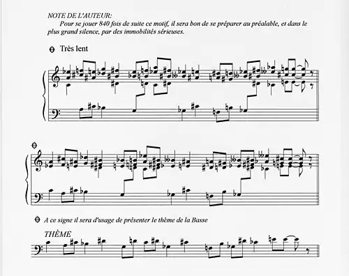 - No metronomical tempo indication: the score mentions "Très lent" (very slow), which could mean anything while the composition has not a melody that could be experienced as falling in one or another "natural" cadence – at least not at first sight: some (e.g. the pianist Armin Fuchs, who executed the work in its entirety several times) argue there is a natural cadence nonetheless (26 quarter-note beats per minute in Fuchs' case, which extends total execution to 28 hours)[7]