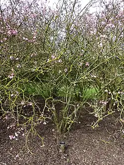 Viburnum grandiflorum, variously called the cranberry bush, flowering viburnum, grand viburnum, and Himalayan viburnum, is a species of flowering plant in the family Viburnaceae, native to the Himalayan region.[1][2] It grows in open forests.[3] A sparse shrub or gnarled tree reaching 2–3 m (7–10 ft), it has showy pink flowers larger than the typical viburnum, and red to black fruit, which are edible.[4] It is hardy to USDA zone 6a.[2] The unimproved species is available from commercial suppliers, as is a putative form, Viburnum grandiflorum f. foetens, the stinking Himalayan viburnum, and a number of cultivars, including 'De Oirsprong', 'Desmond Clarke', and 'Snow White'.[5][6][7][8][9]