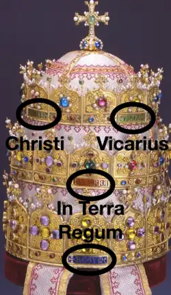 The Protestant writer Andreas Helwig suggested that Vicarius Filii Dei was an expansion of the historical title Vicarius Christi, rather than an official title used by the Popes themselves. His interpretation did not become common until about the time of the French Revolution.[39] Some later Protestant figures asserted that Vicarius Filii Dei was an official title of the Pope, with some saying that this title appeared on the papal tiara and/or a mitre. Some Catholic converts to Protestantism such as Balthasar Hoffman[40] also testified to witnessing the title engraved with 100 diamonds on the 1845 tiara of Gregory XVI.[41]