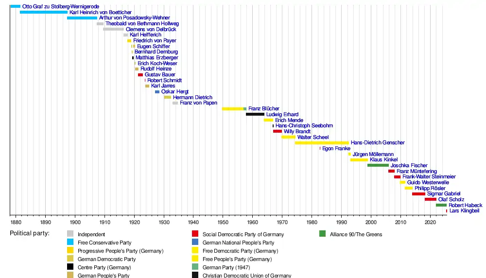 In the Federal Republic (since 1949), the chancellors have had no interest in allowing the deputy to use the title for self-promotion.[3] Since 1966 it became customary that the coalition partner of the governing party received the ministry of foreign affairs, who was also appointed deputy. The ministry of foreign affairs was considered to be the most important cabinet post besides the chancellorship. This tradition faded away during the tenure of Angela Merkel, partially because the leaders of her coalition partners chose a different ministry.