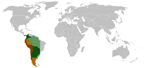 Location of the Viceroyalty of Peru: initial de jure territory 1542–1718 (light green) and final territory 1776–1798[d] (dark green)