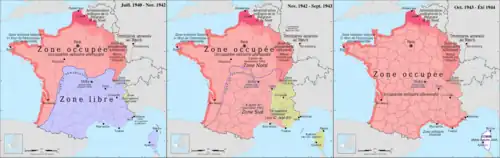 Officially independent, but with half of its territory occupied under the harsh terms of the 1940 armistice with Nazi Germany, it adopted a policy of collaboration. Though Paris was nominally its capital, the government established itself in Vichy in the unoccupied "free zone" (zone libre).[4] The occupation of France by Germany at first affected only the northern and western portions of the country. In November 1942, the Allies occupied French North Africa, and in response the Germans and Italians occupied the entirety of Metropolitan France, ending any pretence of independence by the Vichy government.