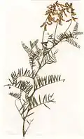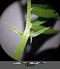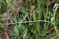 Its alternately arranged leaves are pinnately compound and most of the times consist of 10–18 pairs of narrowly linear to oblong leaflets.[5][7] Pinna can be both hirsute or hairless and usually measure from 2 to 6 millimetres. Vicia tenuifolia has so called paripinnate leaves, that end with a split tendril. Stipules are present; they are narrowly linear, with entire leaf margin and end with a sharpened point.[5]