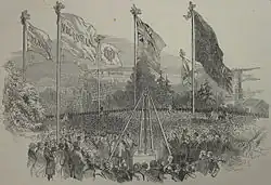 The school was opened on 29 September 1852 with 98 students enrolled.[13] The accompanying ceremony featured a military parade, and the Lieutenant-Governor and the States of Jersey again assembled in the Temple and processed to the Great Hall where the Bailiff addressed the audience. He recalled the royal visit of 1846 and stated that the intention of memorialising that visit had inspired the construction of a college for the instruction of youth and of promenades for the recreation of the public. He stated that the interest shown by the Queen and the Prince in the college had led them to present two portraits. The Lieutenant-Governor then formally presented the portraits of the royal couple. The quality of the portraits, copies of Winterhalter, was criticised in the press.[14] The initial uniform consisted of a jacket, waistcoat and trousers in black or dark green, and a cap of the same colour.[13] The establishment of the college represented the triumph for those who wished to anglicise Jersey.[15]: 589