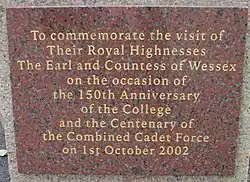 A memorial service was held on 2 June 1946 in the main hall to remember Old Victorians who died in the war. The school quickly returned to its normal functioning, and the next few years saw a range of developments including a wider range of subjects and the building of a new sports pavilion and art building. By 1952, the school was in a state fit to celebrate its centenary, which was marked by a visit from the Duke and Duchess of Gloucester.[17] This development continued into the next decade as an associated preparatory school was opened in 1966.[6] The school's 125 year anniversary was commemorated by Jersey Post with an issue of special stamps on 29 September 1977.[22]