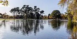 Victoria Lake is a small artificial lake in Hagley Park, Christchurch. Victoria Lake is a 19,294.63 square metres (207,685.7 sq ft) lake in the centre of Christchurch, New Zealand, immediately west of Albert Lake. Hagley Park was established by the Canterbury Provincial Council and began to take shape in the 1860s, but a small swamp in North Hagley Park remained. Victoria Lake was created in 1897 in celebration of Queen Victoria’s Golden Jubilee, by turning the swamp into a lake.[1] A variety of native trees and sand were removed from the swamp to turn it into a lake. Historic photos of Victoria Lake are available on Te Papa's online archive here.
