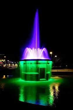 Local businessman Henry Layton Bowker had an office on Colombo Street overlooking the square, and willed a £1,000 portion of his estate to the city to build a fountain near the town hall. After his death in 1921, and with no concrete plans for a town hall to be built, his son suggested the fountain should instead be constructed in Victoria Square to replace the recently removed band rotunda.[121] Designed by city architects A. R. Galbraith and Victor Hean, when the fountain opened in 1931 it was the first to be lit with electricity in the Southern Hemisphere.[122][40] The central plinth of the fountain sits in the centre of a large pool of shallow water. Despite being damaged in the Christchurch earthquake, it was restored and reopened with the rest of the square in 2019. Within hours of reopening a vandal poured washing powder into the fountain, causing it to foam up.[123]