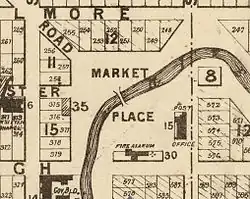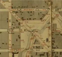 Christchurch was surveyed by Joseph Thomas and Edward Jollie in March 1850, and on these earliest maps the area that became Victoria Square is marked as grassland.[10] On Black Map 273 the area straddling the river can already be seen marked as "Market Place".[11] The third wooden building in Christchurch — a general store owned by Charles Wellington Bishop — was built on the Colombo Street side of the square in early 1851.[12] Market Place was also the location of an important gravel quarry, that provided much of the shingle used for metalling the major gravel roads in early Christchurch, both north to Papanui and east to Sumner.[13] A plaque on Armagh Street marks the location of this early quarry.