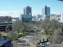 The square was initially bisected north-west to south-east by Whately Road (named after the Archbishop of Dublin, Richard Whately, who was a member of the Canterbury Association).[2] It was later renamed to Victoria Street, and this formed a major route to the north towards Papanui and beyond.[3] Other boundary streets are Kilmore and Durham Streets on the northern and western boundaries, respectively.[4] Victoria Street was stopped from running through the square in 1988 when the Parkroyal Hotel (later the Crowne Plaza) was built.[5][3]