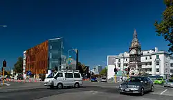 Victoria Square is one of four squares located in the Christchurch Central City.[1] It is located just north-west from its centre, Cathedral Square. The square was initially bisected by Whately Road (named after the Archbishop of Dublin, Richard Whately, who was a member of the Canterbury Association[2]), later renamed Victoria Street, and this formed a major route to the north towards Papanui and beyond.[3] Victoria Street was stopped in 1988 at Kilmore and Durham Streets under much public protest when the Parkroyal Hotel, the later Crowne Plaza, was built.[3][4] When the Crowne Plaza was demolished in 2011/12 following the earthquakes, some were calling for the road to be restored; this included central city business leader Paul Lonsdale.[5] This caused quite a storm of opposition, and soon after, the idea of restoring the road was dropped.