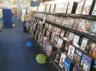 By mid-1985, the United States had 15,000 video rental stores; further, many record, grocery, and drug stores also rented videotapes.[15] By May 1988, the number of specialty video stores was estimated to be 25,000, in addition to 45,000 other outlets that also offered video rentals. Grocery stores in the US rented tapes for as little as $0.49 as loss leaders.[16] The press discussed the VCR "and the viewing habits it has engendered — the Saturday night trip down to the tape rental store to pick out for a couple of bucks the movie you want to see when you want to see it".[17] Video rental stores had customers of all ages and were part of a fast-growing business. By 1987, for example, Pennsylvania had 537 stores that primarily rented videotapes, with annual spending per resident of $10.50. By 1989, six years after its founding, Philadelphia's West Coast Video operated over 700 stores in the US, Canada, and the United Kingdom.[18] In 1987, home video market revenues for the year surpassed box office revenues.[19]