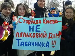 - "Campaign Against Tabachnyk" / "Anti-Tobacco Campaign" (Ukrainian: АнтиТабачна кампанія, Russian: АнтиТабачная кампания) – aimed to protect Ukrainian education and science from the decisions made by the Minister of Education and Science Dmytro Tabachnyk, who had generated controversy amongst pro-European Ukrainians by having a history of making anti-Ukrainian, chauvinistic, pro-Russian, xenophobic statements.[2][3][4]