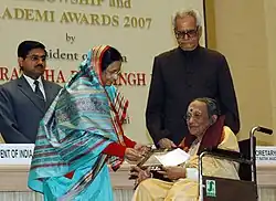 ![]() President Pratibha Patil awarding Vidya Shankar the 2007 Sangeet Natak Akademi Award (Carnatic Instrumental - Veena) | |