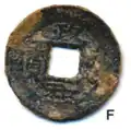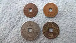 The Vietnamese cash (chữ Hán: 文錢 văn tiền; chữ Nôm: 銅錢 đồng tiền; French: sapèque),[a][b] also called the sapek or sapèque,[c] is a cast round coin with a square hole that was an official currency of Vietnam from the Đinh dynasty in 970 until the Nguyễn dynasty in 1945, and remained in circulation in North Vietnam until 1948. The same type of currency circulated in China, Japan, Korea, and Ryūkyū for centuries. Though the majority of Vietnamese cash coins throughout history were copper coins, lead, iron (from 1528) and zinc (from 1740) coins also circulated alongside them often at fluctuating rates (with 1 copper cash being worth 10 zinc cash in 1882).[7] Coins made from metals of lower intrinsic value were introduced because of various superstitions involving Vietnamese people burying cash coins, as the problem of people burying cash coins became too much for the government. Almost all coins issued by government mints tended to be buried mere months after they had entered circulation. The Vietnamese government began issuing coins made from an alloy of zinc, lead, and tin. As these cash coins tended to be very fragile, they would decompose faster if buried, which caused the Vietnamese people to stop burying their coins.[8][9]