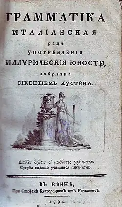 - ^ Costantini, Lionello (1976). Slavo ecclesiastico e volgare nella Grammatika italianskaja di Vikentije Ljuština: Lionello Costantini (in Russian). Licosa Ed.