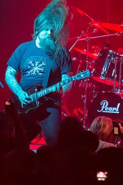 Enslaved, a formative band in Viking metal, performs primarily a black metal style, but has over time become more progressive.[73] Eduardo Rivadavia described the hallmarks of Enslaved as "Viking themes, razor sharp guitars, blastbeat drums, and an ear for orchestration resulting in complex structures, bountiful harmonies and time changes."[69] The band evolved significantly with every album since Mardraum – Beyond the Within (2000).[74]