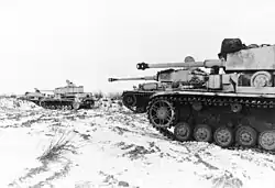 After recovering from his injuries, in May 1942 Mikhailov was sent to study at the Moscow military school. The rapid deterioration of the Soviet military position that summer forced the call up and deployment of the students, and Mikhailov was sent to the North Caucasus as commander of a 45-mm anti-tank gun.[4] He fought in the Battle of the Caucasus and the recapture of the Taman Peninsula, receiving two Orders of the Red Star over this period.[3] He then took part in the Crimean offensive, where in fighting around the town of Malin, forces under his command knocked out two Nazi Panzer IVs. He was again wounded, this time in fighting around Shepetivka on 14 January 1944.[3] After recuperating, Mikhailov was sent to the Ivanovo Military-Political School, graduating with honours and the rank of lieutenant in late 1944. He was then sent to the 1st Ukrainian Front to join the tank forces.[3][6] Mikhailov ended the war in Berlin as a political officer of a battalion, a position he held for a further five years, then rising to the position of deputy commander of a tank regiment for political affairs.[3]