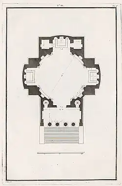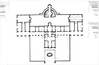 Palladio planned the villa on low lines extending into a large park. The ground floor plan is complex: rectangular with perpendicular rooms on a long axis, the central block projects and contains the principal reception room. The central block, which is designed to resemble the portico of a Roman temple, is decorated by four Ionic columns, a motif which takes its inspiration from the Temple of Fortuna Virilis in Rome. The central block is surmounted by a large pediment with heraldic symbols of the Barbaro family in relief.[6] Below the pediment is a Latin inscription on the entablature dedicating the villa to the brothers' father; the inscription translates, "Daniel Barbaro, Patriarch of Aquileia, and Marcantonio his brother, sons of Francesco Barbaro".[7]