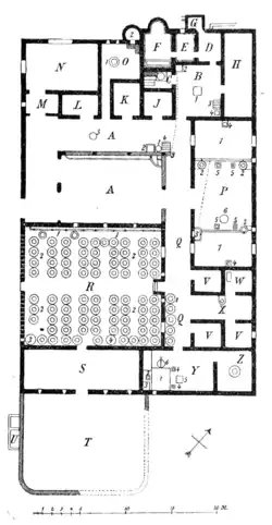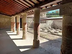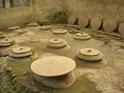 It also includes preserved parts of a wine press.[11] Near the center of the villa is the wine cellar in which 18 dolia, of total capacity 10,000 liters, were buried for storing the must from the adjoining press.