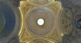 This austere character means the building lacks the architectural elegance of noblemen's palaces. The villa was enlarged in the eighteenth century with the building of a number of structures at both ground and first floor level. The most important addition was a chapel, complete with dome and lantern. The chapel was dedicated to the Immaculate Conception.[6] It may have been designed by Andrea Belli, as it is similar in style to other works by this architect. If not for the chapel's dome, surmounted by balustrades, the villa would be easily mistaken for a rustic farmhouse. This first floor contains a typical piano nobile with three-centred arches and large rooms with high ceilings.[3]