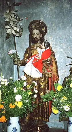The community's church, Santo Domingo Díaz Ordaz, was built in 1526 and is noted for a number of santos, traditional statues of Roman Catholic saints. Some can be dated to the sixteenth century but are still preserved and in use by local citizens, who provide them with flowers and sometimes even with modern dolls as adjuncts, as in the image on the left.[2]