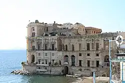 The original building on the site was probably built by one Dragonetto Bonifacio in the early 15th century. It changed hands a number of times and finally was inherited in 1630 by the woman whose name it now bears, Anna Carafa, duchess of Stigliano and wife of Ramiro Núñez de Guzmán, the Spanish Viceroy of Naples. She had the building redone by architect Cosimo Fanzago in the 1640s. When her husband returned to Spain alone in 1644, the unfinished palace was left abandoned and neglected[1] The palace was purchased from the heirs of Anna Carafa by Teora Mirelli.[2] The grand but decaying baroque building projecting directly into the sea presented an irresistible subject for eighteenth- and nineteenth-century artists. In particular, thanks to the nearby villa of William Hamilton, many were the foreign and British travellers who remained fascinated.[3] By the beginning of the 19th century, the structure was still markedly dilapidated. In the early 1900 a French family, Genevois, bought it and started transforming it as it appears to be today. The Western wing was sold in 1928 to the Colonna di Paliano family and later to many more families, being fractioned by the Genevois heirs in smaller units. Part of the building is still a ruin, but most of it is currently used as a residence, including the home gallery of art dealer Lia Rumma and for Napoli football player Dries Mertens.