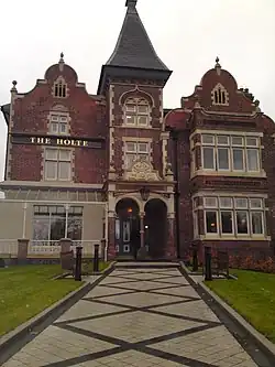 The Holte End is a large two-tiered stand at the south end of the stadium. Originally a large terraced banking with accommodation for more than 20,000 spectators, the current stand was constructed in 1994–1995 and consists of two tiers with no executive boxes. The two tiers are slightly curved in a parabola to provide good sightlines from all seats. Inside there are three levels of concourse and the Holte Suite, a large hospitality room for supporters.[41] The roof is a variant of the "King Truss" system and the front third slopes slightly forward.[42] Two large staircases, pediments, Dutch gables and a mosaic introduced in the 2007 season in the style of the old Trinity Road Stand make up the facade, itself inspired by Aston Hall.[41] The Holte End is the most renowned stand at Villa Park amongst home and away team supporters.[1] Traditionally, Villa's most vocal and passionate supporters gather here, including members of Aston Villa hooligan firms.[43]
