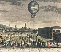 Paolo Andreani had seen a model balloon built by Agostino Gerli and his brothers ascend a few feet powered by hot air.[5] Andreani undertook to fund the Gerli brothers to build a much larger hot-air balloon with a diameter of 23 m (75 ft) that would be capable of allowing a man to take to the air. The balloon took 24 days to make and its laden weight was about 1,300 kg (2,900 lb). The first flight was on 25 February 1784.[6] An invited crowd then gathered on 13 March 1784 at the Villa Sormani which was his brother's residence.[5] The spectators saw Andreani and two of his assistants ascend to a height of over 1,500 m (4,900 ft) whilst the balloon travelled several kilometres.[6] The emperor who missed the spectacle[5] arranged for a medal to be made. The medal featured Gerli's balloon on one side and Andreani on the other to commemorate the ascent.[7]