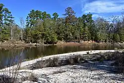 The forested area includes bald cypress, river birch, riverflat hawthorn, and yaupon holly trees. The park has a longleaf pine restoration project in progress.