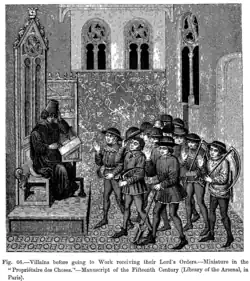 The term villain first came into English from the Anglo-French and Old French vilain, which in turn derives from the Late Latin word villanus.[4] This refers to those bound to the soil of the villa, who worked on the equivalent of a modern estate in Late Antiquity, in Italy or Gaul.[5]